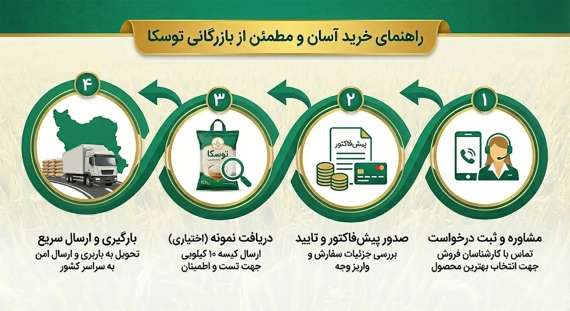 بازرگانی برنج توسکا مرکز تخصصی تامین و پخش مستقیم از شالیزار و کارخانههای بوجاری شمال است. ما با حذف واسطهها، بهترین قیمت برنج عمده را در کنار ضمانت کتبی یکدستی و خلوص ۱۰۰ درصد به مشتریان خود ارائه میدهیم. اگر به دنبال مرجعی معتبر برای خرید برنج عمده با پخت تضمینی و ارسال سریع هستید، مجموعه ما آماده همکاری پایدار با بنکداریها، رستورانها، تالارها و ارگانهای سراسر کشور در تناژ بالا میباشد. هدف ما تامین بار درجهیک و یکنواخت برای رونق کسبوکار شماست.