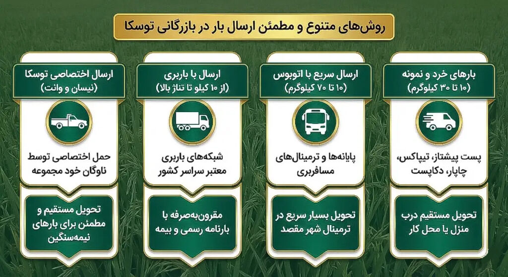 فرقی نمیکند قصد دریافت یک کیسه ۱۰ کیلویی برای «تست و نمونه» را داشته باشید یا سفارش شما در ابعاد چند تُن باشد؛ ما با بهرهگیری از متنوعترین شبکههای لجستیکی (از ناوگان اختصاصی توسکا گرفته تا شبکههای باربری معتبر و پست)، مقرونبهصرفهترین و سریعترین روش را متناسب با حجم سفارش شما انتخاب میکنیم. جزئیات روشهای ارسال ما را در تصویر زیر مشاهده کنید: