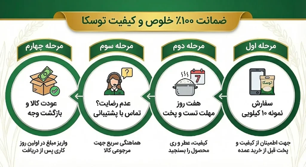 خرید شما از مجموعه بازرگانی توسکا، تنها یک تراکنش تجاری نیست؛ بلکه آغاز یک تعهد دوجانبه برای حفاظت از عطر و طعم سفره‌های ایرانی است. ما با اطمینان کامل به کیفیت محصولات خود، شفاف‌ترین قوانین خرید را برای شما تدوین کرده‌ایم تا تجربه‌ای بدون دغدغه داشته باشید.